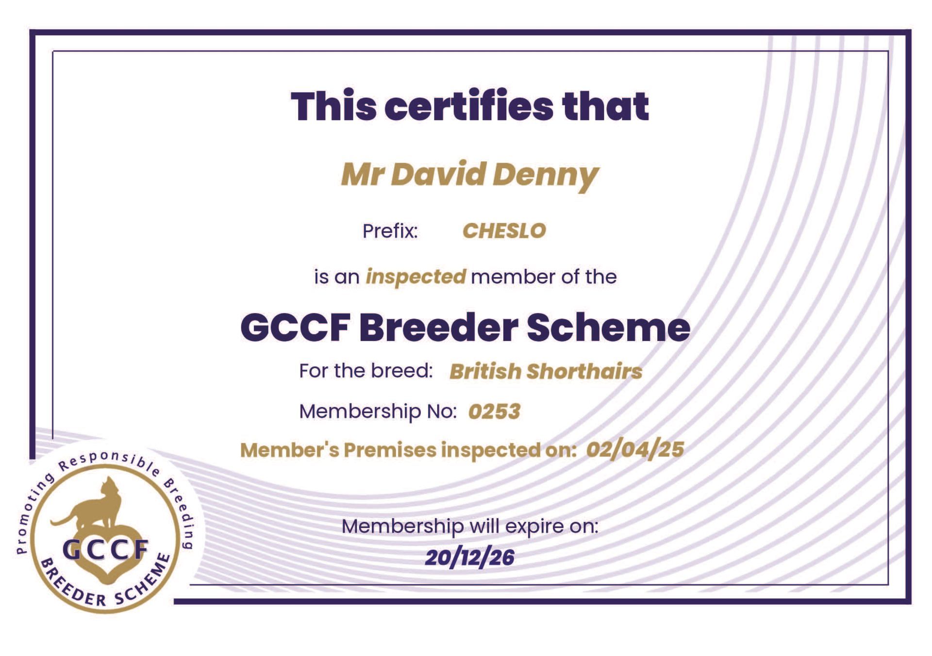 Cheslo is a registered prefix with the GCCF. I am also a member of the breeders scheme which promotes responsible breeding, full details can be found by following the link to their site below.